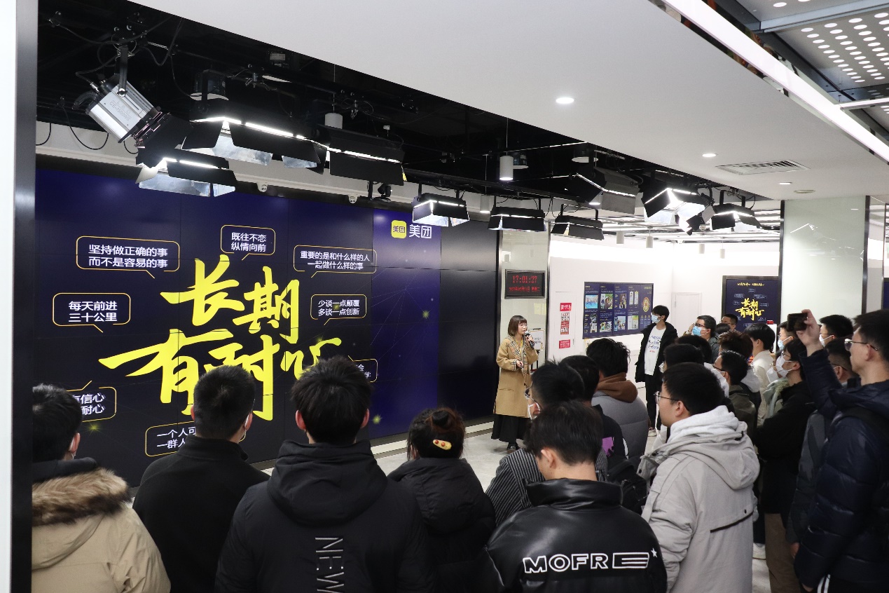 师生团队参观了美团综合指挥中心,聆听了美团工作人员对于美团发展历程、服务内容、小说阅读网和社会价值的介绍。之后,结合师生计算机专业背景,工作人员展示了美团大脑、袋鼠力量、智能配送车、无人机和一系列智能项目,师生团队对于美团在相关领域的科技实力有了更新的认识。参观结束后,美团校招组工作人员向同学们介绍了美团校招的相关情况,传达了美团对于校招生能力培养和自我价值实现的重视,同学们也对日常实习、简历筛选等方面问题与工作人员进行了沟通交流,活动在热烈的气氛中顺利结束。