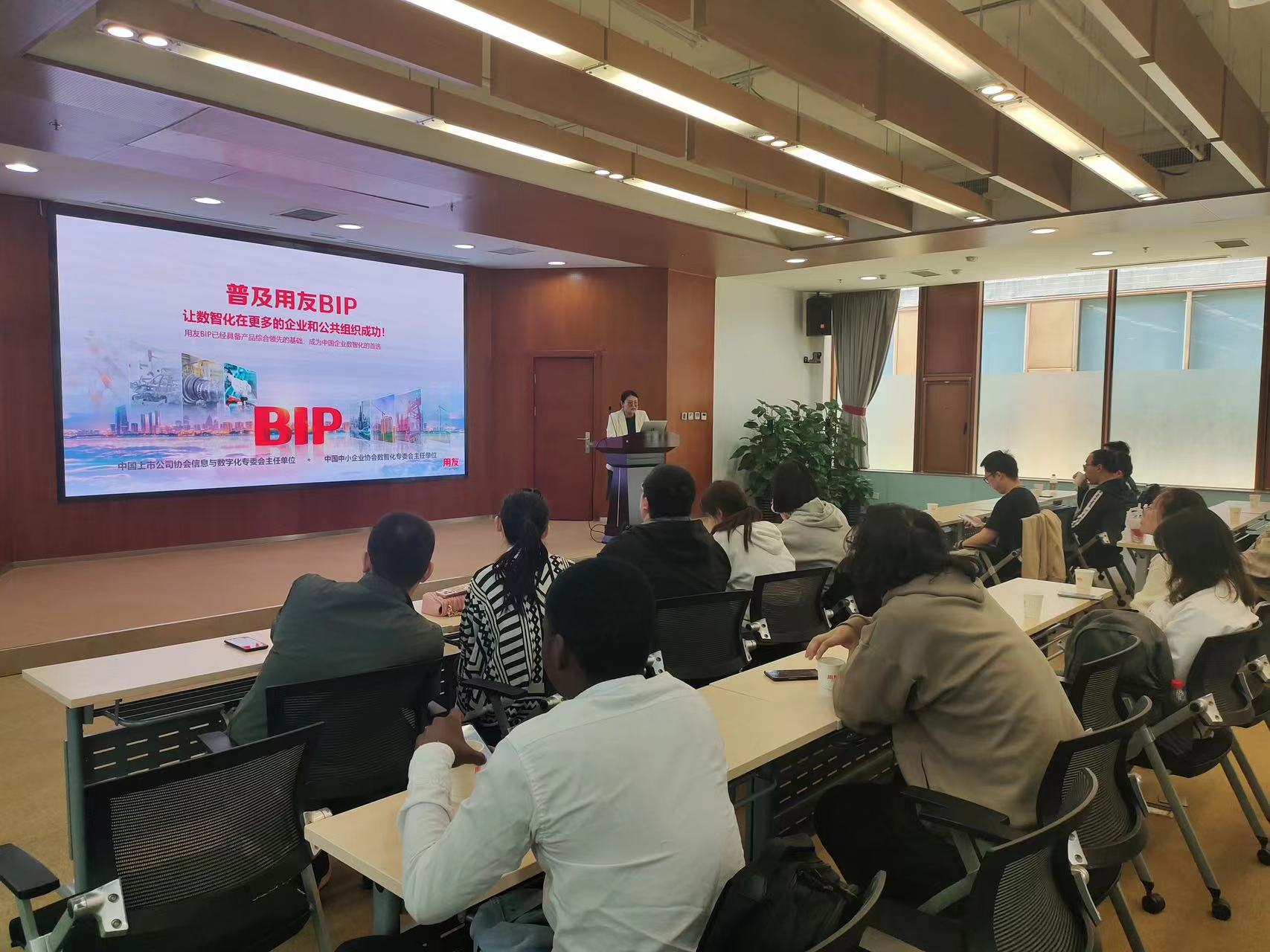 师生团队首先在用友集团工作人员的带领下参观了用友产业园,对于园内功能分区,员工福利等有了大致了解。在交流座谈环节中,用友集团人力资源部招聘COE、校招经理杜静静首先以《企业数智化 用友BIP》为主题向师生团队进行介绍,分别从公司使命、最新发展、核心产品、客户价值等角度对用友集团进行了介绍。用友集团人力资源部雇主品牌经理赵金凤介绍了用友集团的校招情况,从校招批次、薪酬体系、成长培训、发展体系、小说阅读网、激励机制和实习生计划多个方面进行了详细介绍。在交流环节中,针对同学们所关心的员工宿舍、落户机制、大模型布局等问题,双方进行了深入交流。